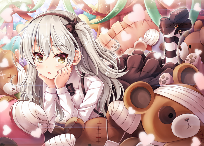 illustration, long hair, anime, anime girls, teddy bears, dress, cartoon, gray hair, Girls und Panzer, Sshimada Arisu, mangaka, HD Wallpaper
