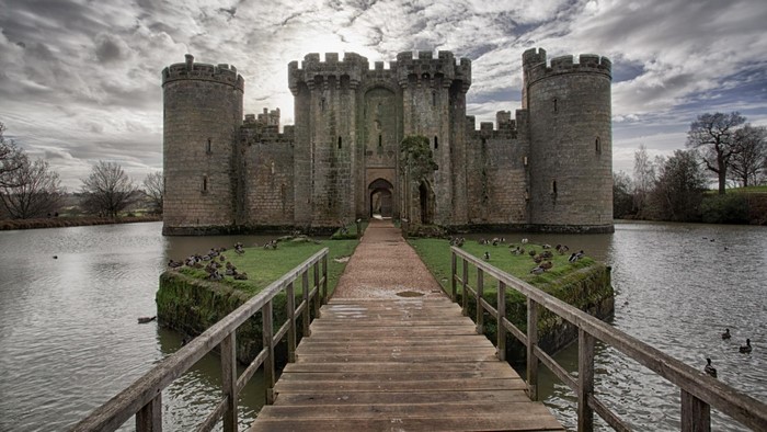 trees, landscape, birds, architecture, lake, water, nature, building, wooden surface, reflection, grass, clouds, England, castle, tower, bridge, duck, pier, UK, ruins, chateau, Abbey, estate, moat, landmark, waterway, ancient history, HD Wallpaper