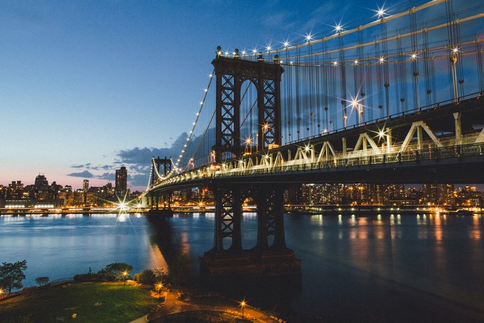cityscape, night, building, reflection, evening, bridge, dusk, Manhattan Bridge, landmark, nonbuilding structure, cable stayed bridge, HD Wallpaper