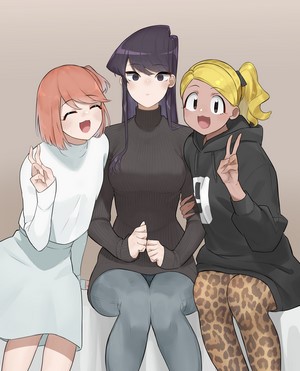 smiling, open mouth, redhead, simple background, looking at viewer, blushing, Comyushou desu., peace sign, Komi-san wa, 2D, blunt bangs, Manbagi Rumiko, blond hair, hair in face, black sweater, pantyhose, ponytail, anime, long sleeves, white bed sheets, bangs, Komi Shouko, in bed, black hair, jeans, hugging, thighs, alternate outfit, in bedroom, Shibuki Ase, closed eyes, long hair, short hair, Takita, anime girls, turtlenecks, white dress, black eyes, fan art, happy face, dark skin, curvy, foggy window, JK, HD Phone Wallpaper