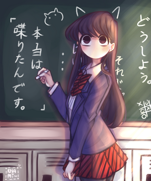 vertical, fan art, black eyes, thighs, black hair, Komi-san wa, nekomimi, 2D, Komi Shouko, Comyushou desu., looking at viewer, long hair, school uniform, anime girls, JK, blushing, blackboard, pantyhose, HD Phone Wallpaper