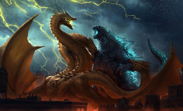 digital, attack, fictional creatures, battle, Godzilla, Godzilla: King of the Monsters, blue, creature, rain, artwork, storm, city, science fiction, lightning, clouds, movies, digital art, fantasy art, King Ghidorah, fictional, environment, yellow HD Wallpaper