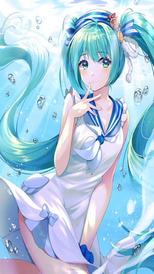 anime, anime girl, long hair, green hair, green eyes, yellow eyes, water, hat, ponytail, cyan hd download, 2101x3000, HD Phone Wallpaper
