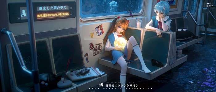 4K, red eyes, Asuka Langley Soryu, anime girls, knee high socks, blue hair, brunette, blue eyes, vehicle, striped socks, Ayanami Rei, Neon Genesis Evangelion, legs, white socks, socks, Z-AO, HD Wallpaper