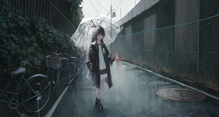 umbrella, kgmnx, anime girls, anime, 2D, artwork, digital art, bicycle, dark hair, portrait, dress, looking below, open coat, HD Wallpaper