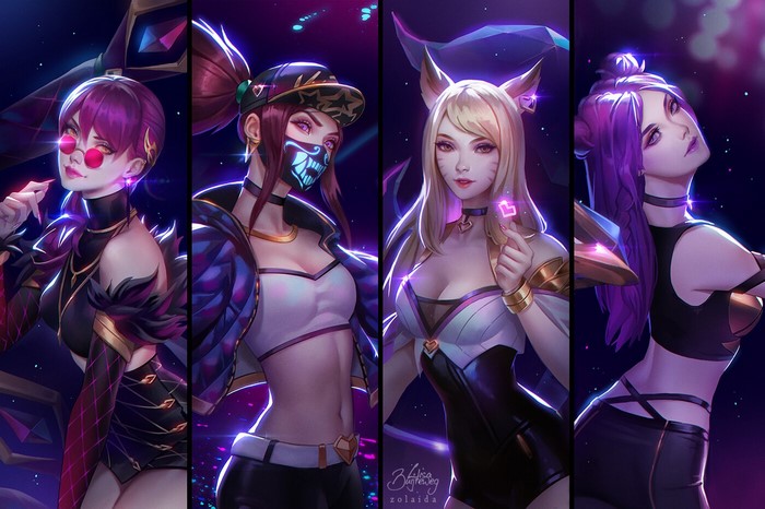 redhead, sparks, Akali(League of Legends), hairbun, stars, mask, heart, sportswear, pink, ponytail, League of Legends, Ahri (League of Legends), lipstick, makeup, Evelynn (League of Legends), fashion, women, group of women, long nails, KaiSa (League of Legends), dress, long hair, glasses, purple hair, straight hair, drawing, jacket, blonde, cleavage, HD Wallpaper