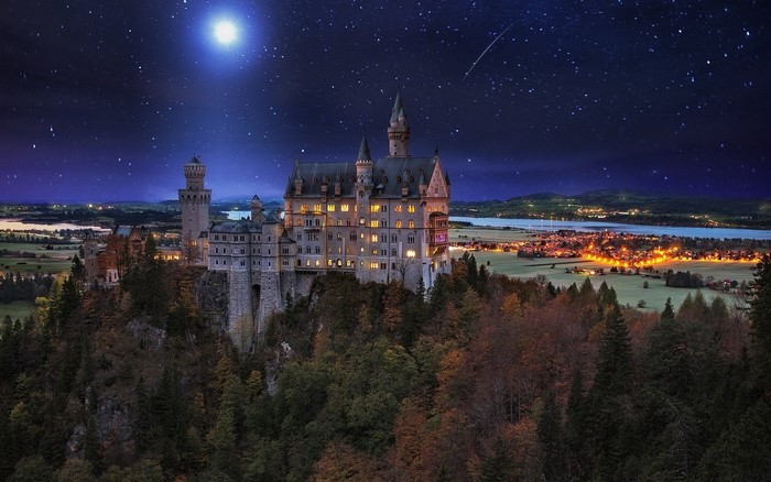 landscape nature neuschwanstein castle germany starry night moon valley trees lights architecture village palace fall, HD Wallpaper