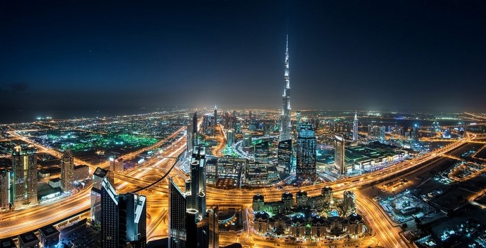 landscape cityscape dubai skyscraper night lights mist united arab emirates highway burj khalifa architecture modern urban metropolis, HD Wallpaper