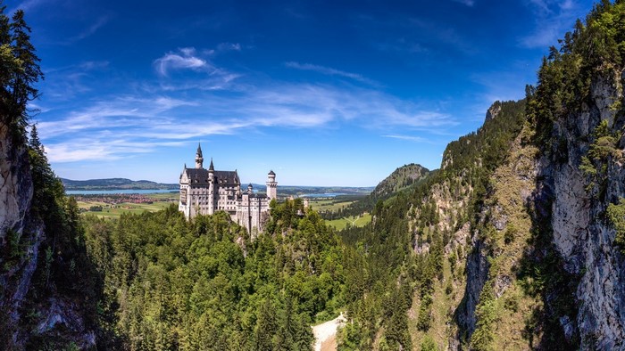 rocks, trees, landscape, Germany, water, grass, clouds, nature, forest, daylight, sky blue, Neuschwanstein Castle, Bavaria, castle, sunlight, photography, HD Wallpaper